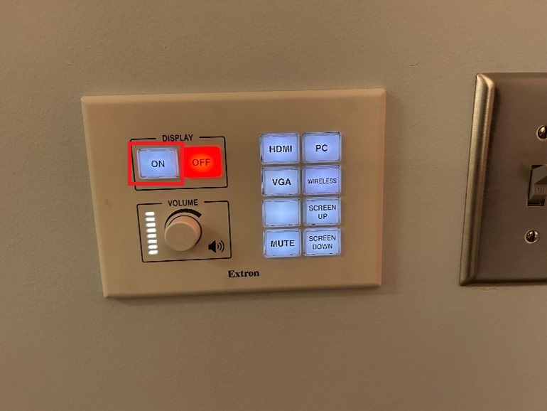 Power on the Control Wall Panel mounted at the front of the room; press the On button in the Display section.