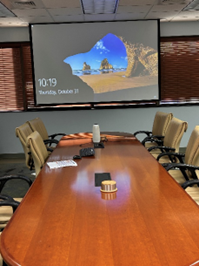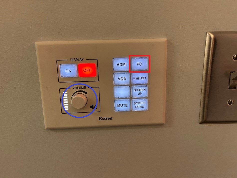 There is a designated PC under the conference table. It can be used by pressing the PC button on the Control Wall Panel. Room audio volume is also with the Control Knob