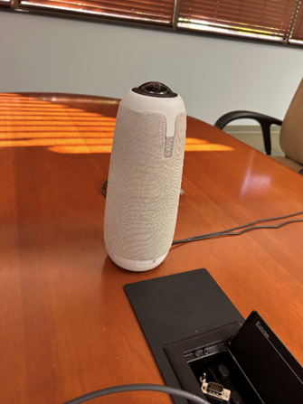 There is an Owl Labs Meeting Owl 3 – Camera and Microphone for use that is connected to the designated room PC for Teams or Zoom calls.