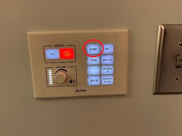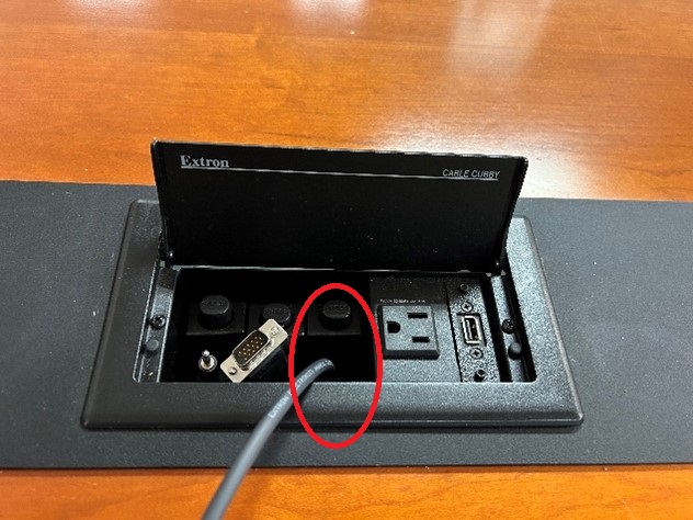 Your HDMI cable will go from the table port shown below to your laptop. Make sure to press the HDMI button on the Control Wall Panel.